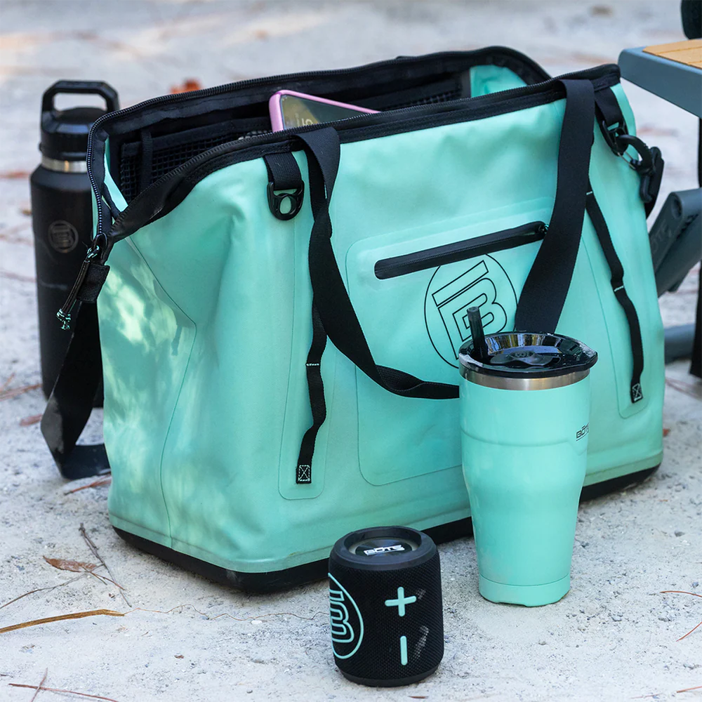 The bag that holds its shape and gets out of your way. The wide hinged opening stays open on its own so you can see everything and grab anything without digging. Water-resistant materials handle sand, spray, and the kind of days that get messy. Wipes clean or hoses out. Carry it crossbody or hook it onto your Mule Chair and go hands free.